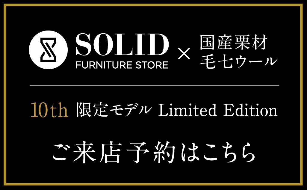 効率や均一さを優先せず、 織りのリズムや糸の表情をあえて残すことで生まれる、わずかな揺らぎや陰影。また毛七は、素材本来の色合いを活かすため、 染色を施さず、異なる色味をそのまま集めて生地として再構成しています。意図的につくられた均一さではなく、素材が持つ色や表情をそのまま受け入れること。それは、無垢材の木目や節を選別しすぎずに活かす、 SOLIDの「ヴィンテージワイルド」という考え方とも重なります。