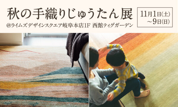 ライムズでは11月1日(土)~11月9日(日)までライムズデザインスクエア岐阜本店西館1Fティグガーデンにて【秋の手織りじゅうたん展】を開催します。南ペルシャの手織りじゅうたん「アートギャッベ」や日本の暮らしに合う「ハグみじゅうたん」など自然素材・手仕事じゅうたんが一同にご覧いただけます!手仕事じゅうたんの良さをぜひ会場でご体感ください。【来場特典】期間中、事前予約でご来店の方に魔法のタオルエアーカオルプレゼント!